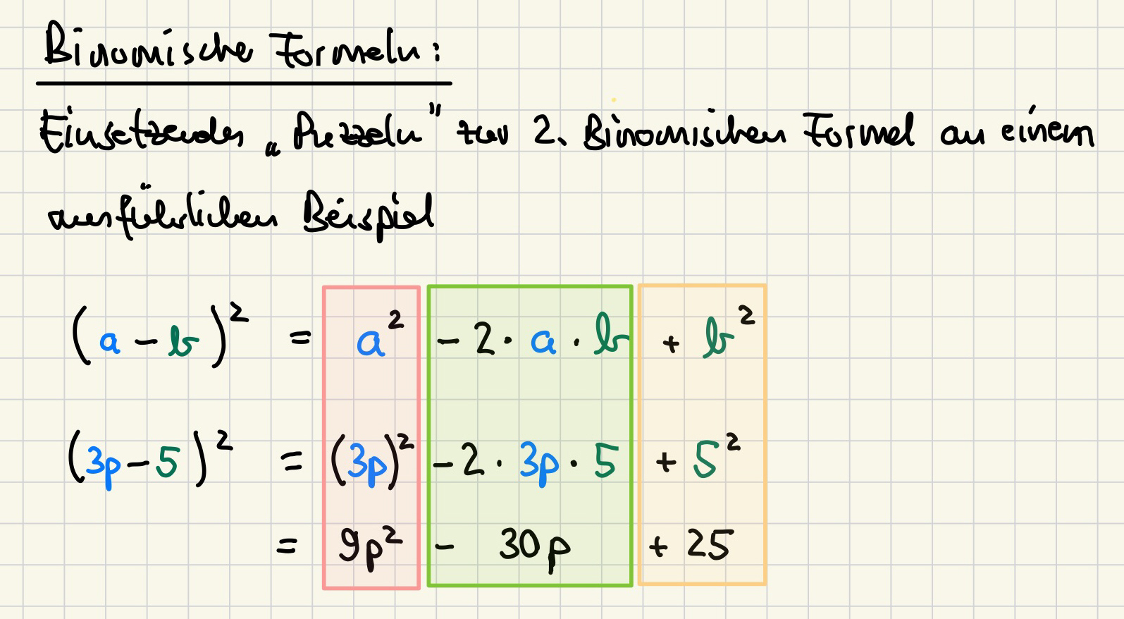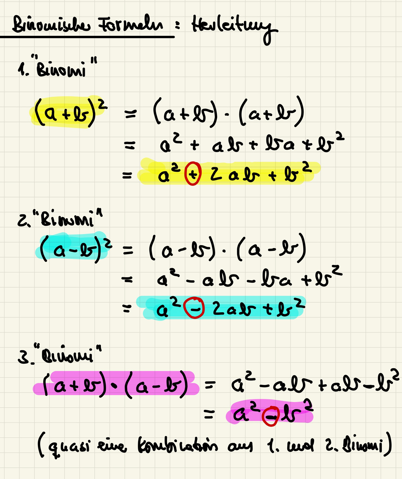 Das Tafelbild zur Herleitung der Binomischen Formeln (Anklicken zum Vergrößern):