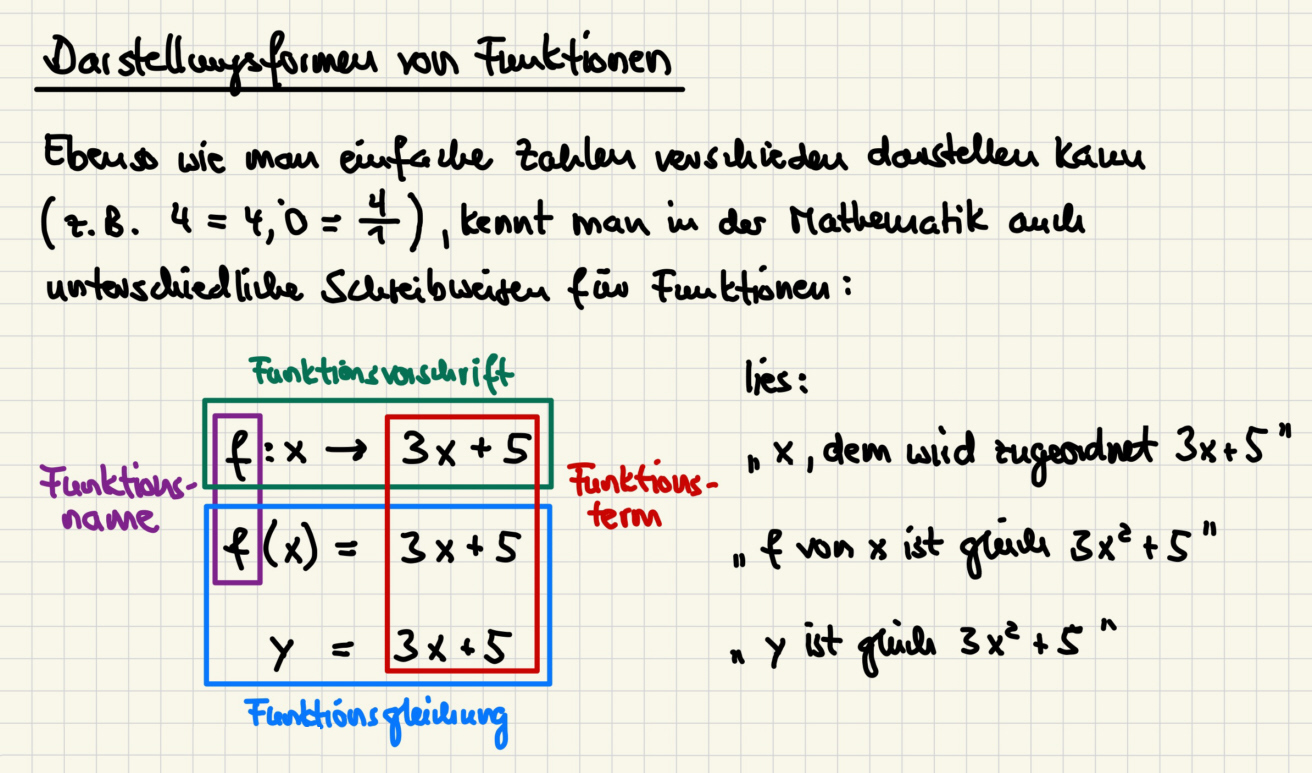 Das Tafelbild zu Lineare Funktionen (Funktionsgleichung y = mx + b) (Anklicken zum Vergrößern):