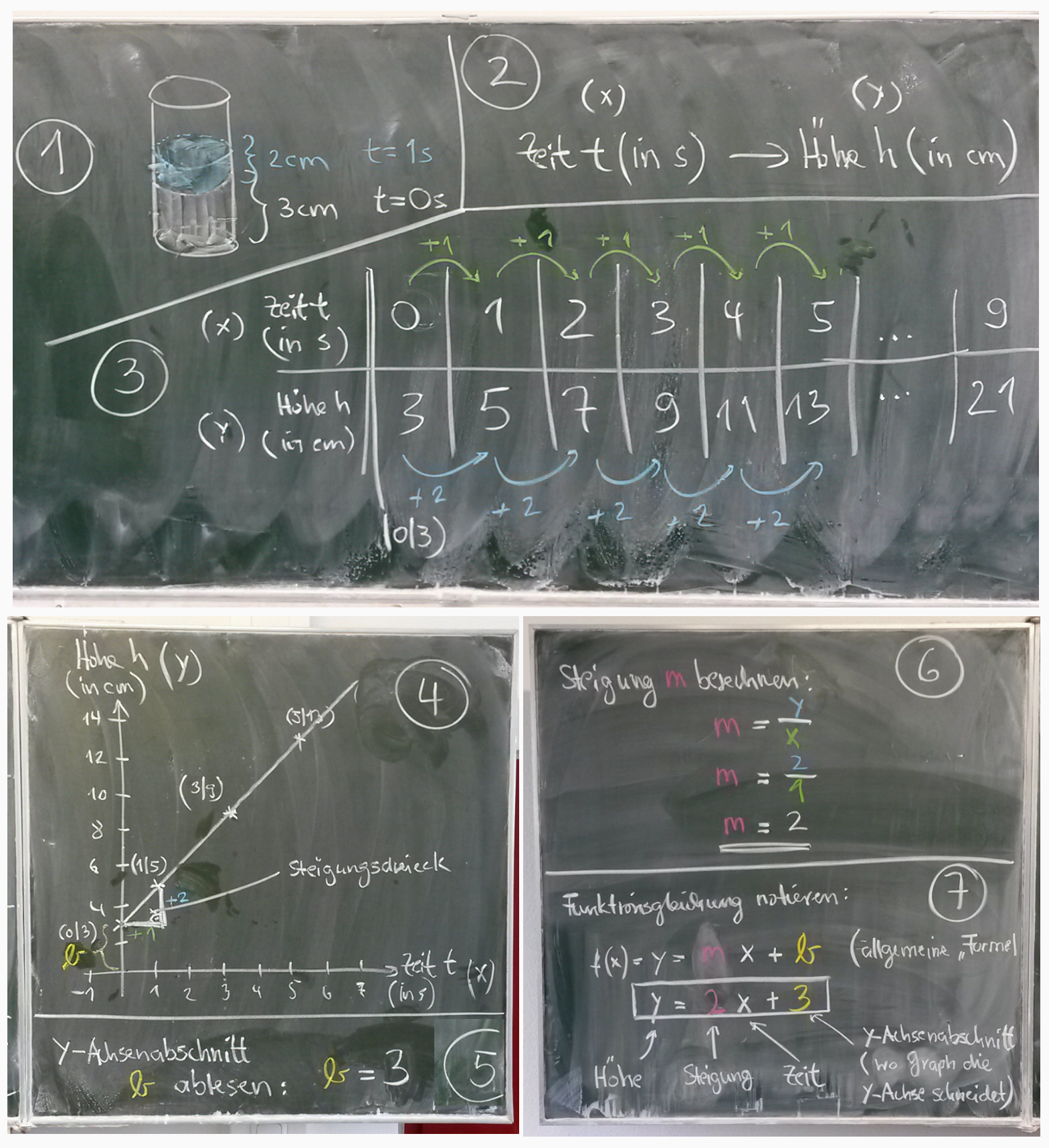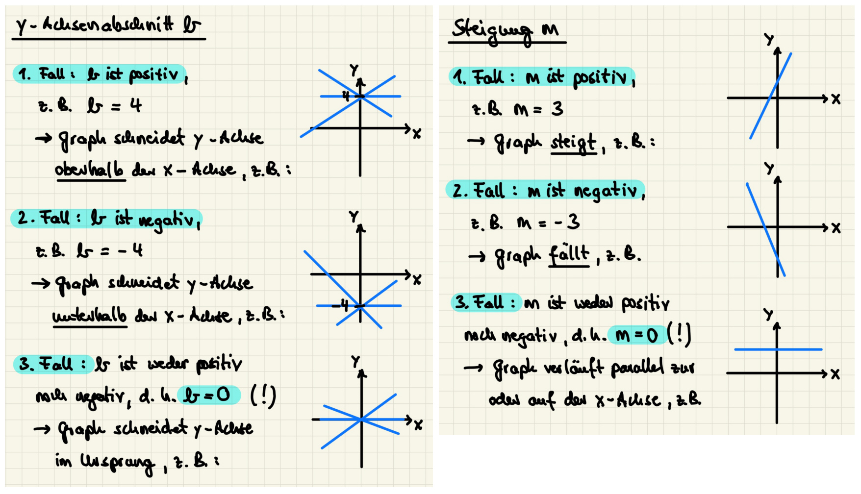 Dazu zählen ergänzend auch das Tafelbild zum y-Achsenabschnitt b und zur Steigung m (Anklicken zum Vergrößern)...