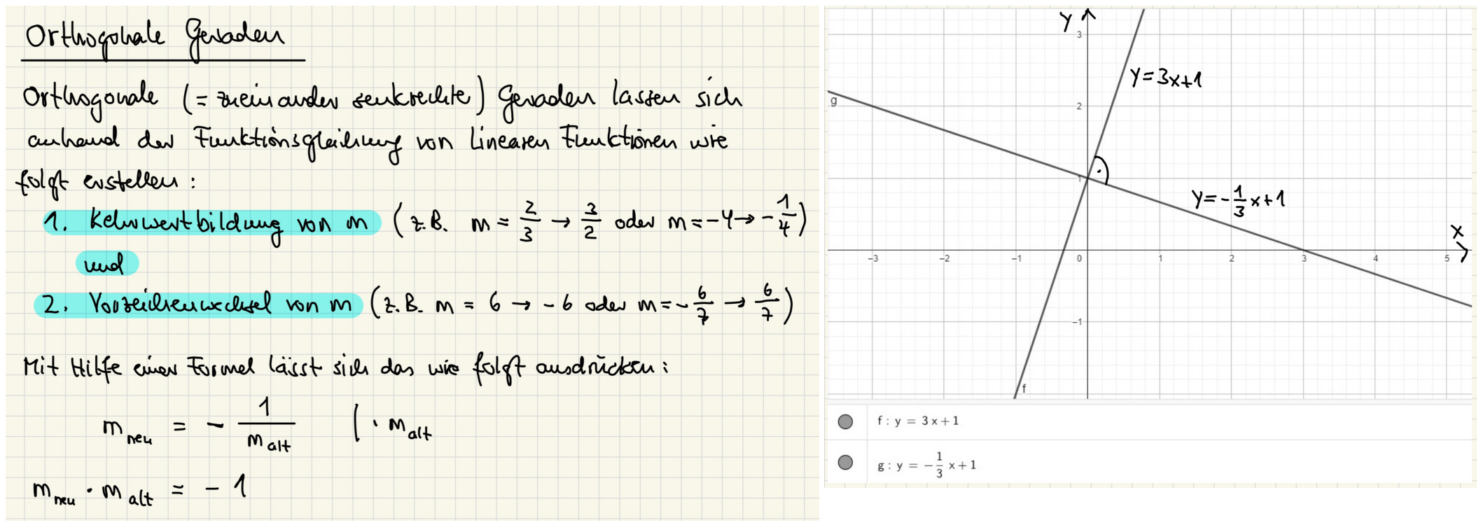...und das Tafelbild zu orthogonalen Geraden (Anklicken zum Vergrößern):
